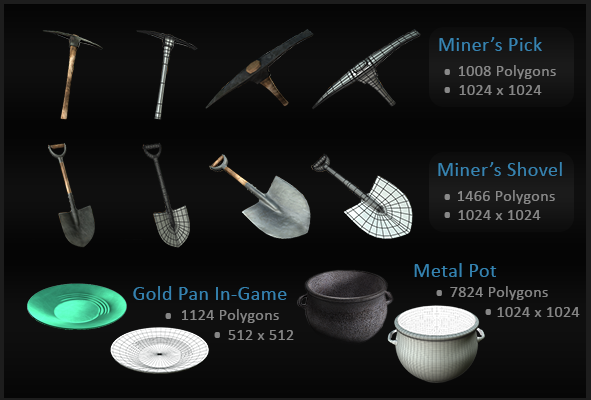 Since the Gameplay for Gold Pan Fever is mostly 2D assets as well as for GUI purposes the assets are high poly count to ensure nice smooth and detailed renders.